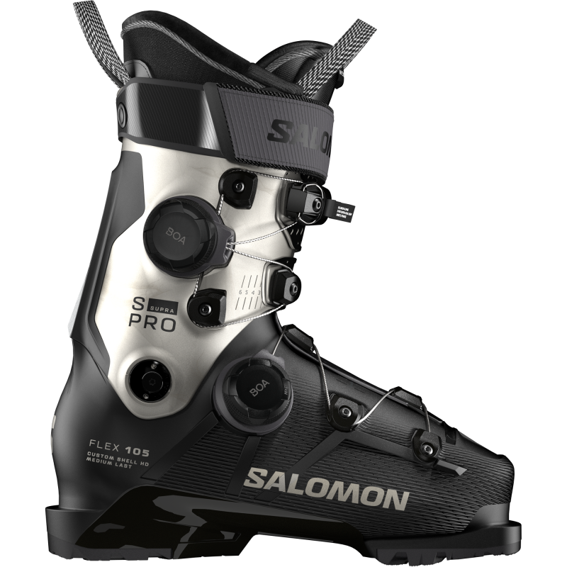 Salomon's S/Pro Supra Dual BOA® 105 women's boots revolutionize micro-adjustable sensitivity. Featuring a women-specific cuff and two BOA® dials, these boots deliver a customized fit, providing optimal support at the cuff and precise comfort in the lower shell. The result? Enhanced performance that keeps women comfortable on every slope.